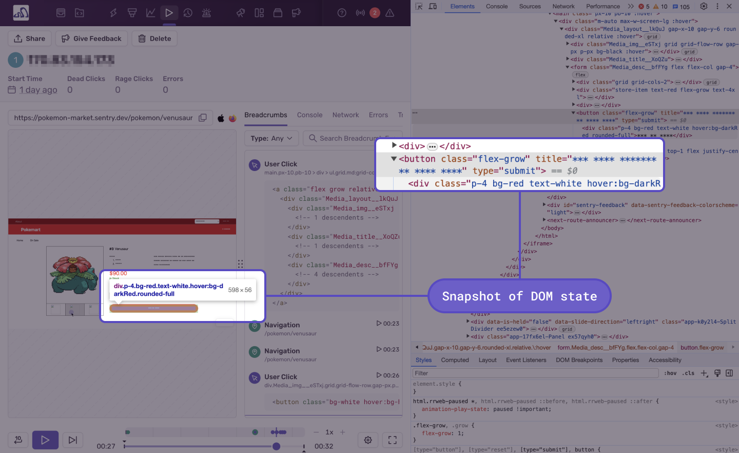 Session Replay allows you to see video-like reproductions of user sessions which can help you understand what happened before, during, and after an error or performance issue occurred. You'll be able to gain deeper debugging context into issues so that you can reproduce and resolve problems faster without the guesswork. As you play back each session, you'll be able to see every user interaction in relation to network requests, DOM events, and console messages. It’s effectively like having DevTools active in your production user sessions.